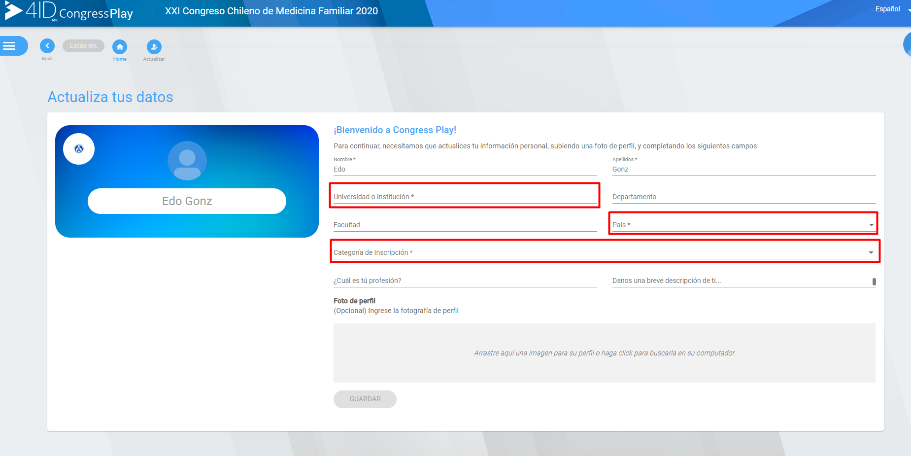 2.- Complete su perfil (los campos marcados en rojo son obligatorios)